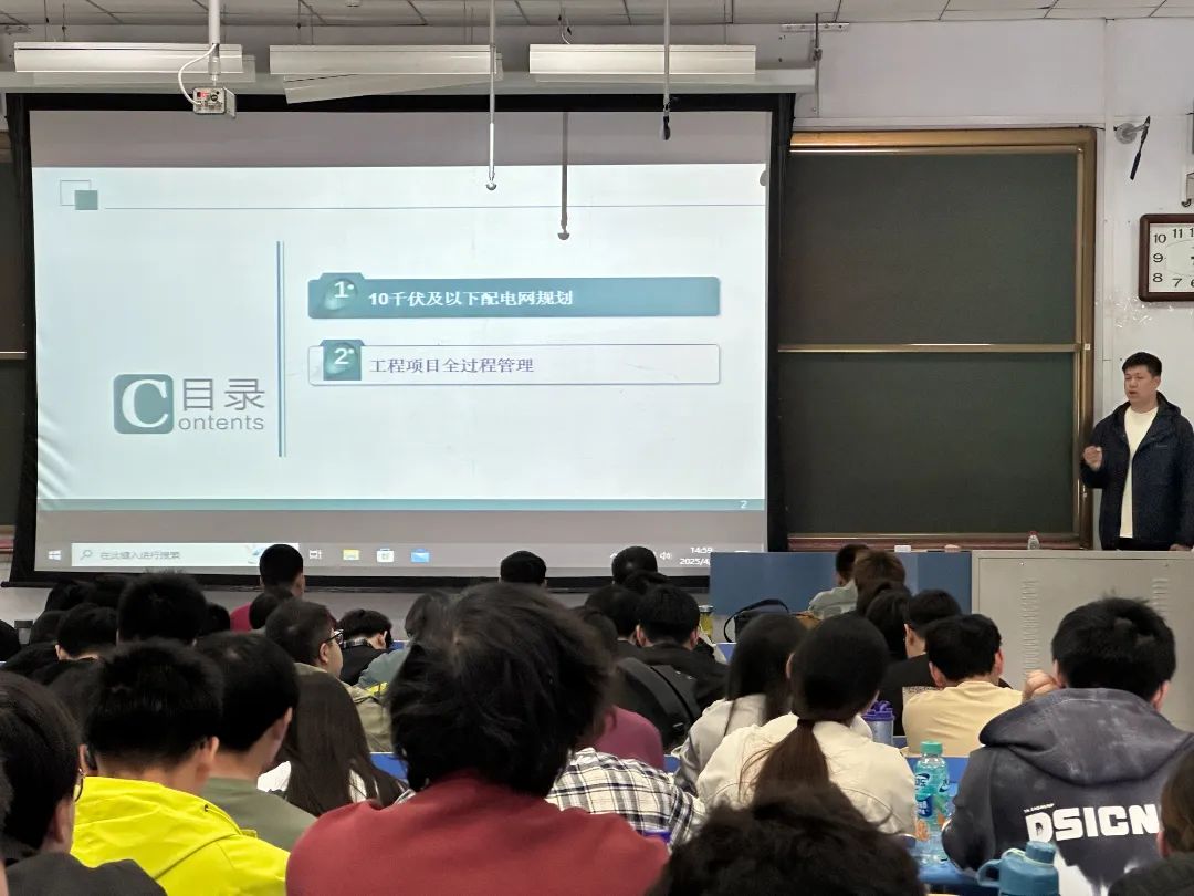 讲座中,宋星乐工程师主要讲解了10千伏及以下配电网的规划。深入解析了电网规划的技术标准、负荷预测方法及区域适应性策略,强调通过科学规划体系提升供电可靠性与能效水平;接着系统梳理项目立项、设计、实施到验收的全周期管控要点,结合案例分析资源配置优化、风险预控及数字化管理工具的应用。作为电气工程专业毕业生,宋星乐立足职业发展路径,建议师生关注“双碳”目标下的行业转型机遇,引发师生对人工智能在电力领域应用的深度思考。