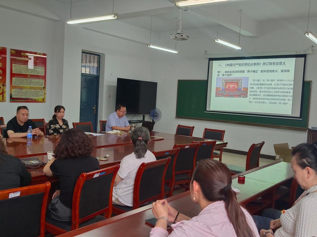 于江利对《中国共产党纪律处分条例》修订意义、修订的主要内容、贯彻条例的学习要求三个方面内容进行了讲于江利着重解读了总则部分的“一个指导思想”“两个坚决维护”“三个重点查处”“四种形态”,对违反组织纪律、廉政纪律等行为的处分进行了重点讲解,强调全体教师党员要全面贯彻新修订的《条例》,增强遵规守纪自觉,营造风清气正的育人环境。