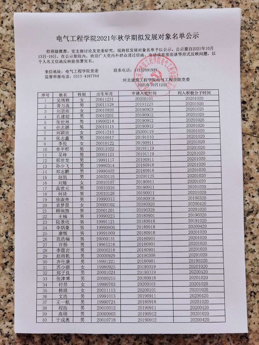 yl永利集团官网登录秋学期拟发展对象公示已在各公示栏张贴,公示期自2021年10月13日-19日,在公示期限内,欢迎广大党内外群众通过信函、电话或直接面谈等形式反映问题。