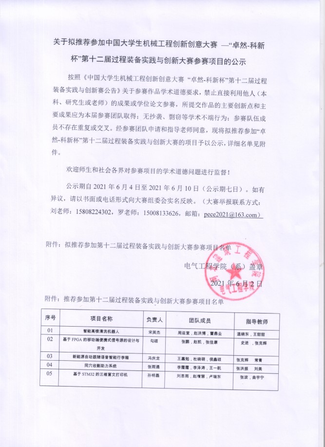 按照《中国老员工机械工程创新创意大赛 “卓然-科新杯”第十二届过程装备实践与创新赛公告》关于参赛作品学术道德要求,禁止直接利用他人(本科、研究生或老师)的成果或学位论文参赛,所提交作品的主要创新点和主要成果应为本届参赛团队取得;无抄袭、剽窃等学术不端行为;参赛队伍成员不存在重复或交叉。经参赛团队申请和指导老师同意,现将拟推荐参加“卓然-科新杯”第十二届过程装备实践与创新大赛的项目予以公示,详细名单见附件。