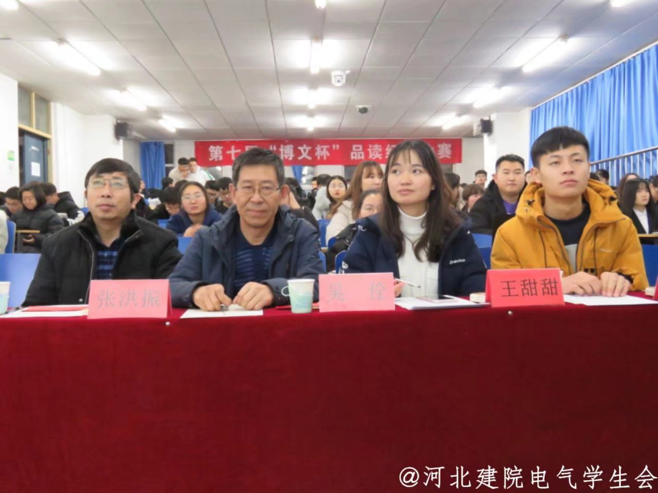 经过初赛的激烈角逐,八支队伍一路过关斩将,站在了决赛的舞台。本次比赛分为“书海徜徉窥经典”、“博览群书显文采”和“品读悟化再演绎”三个环节。“书海徜徉窥经典”环节参赛选手精彩的PPT展示与声情并茂的演讲把现场观众引入于小说演绎的世界里;“博览群书显文采”环节选手们沉着冷静,从容答题,他们丰富的知识储备与快速的反应能力,令观众不由得发出赞叹。“品读悟化再演绎”环节选手们用小话剧的形式将书中精彩故事情景再现,他们将话剧中的每个角色表现得淋漓尽致,让经典之光再次照进现实。结束了紧张激烈的比赛环节,由徐筝为同学们带来了一场精彩的古筝表演——《小小竹排》。清新悦耳的音乐结束之后张洪振老师对本次比赛作出总结点评,他对同学们的努力予以肯定,为同学们提出了宝贵的建议,鼓励同学们在日后的生活中能多读书,读好书,好读书。